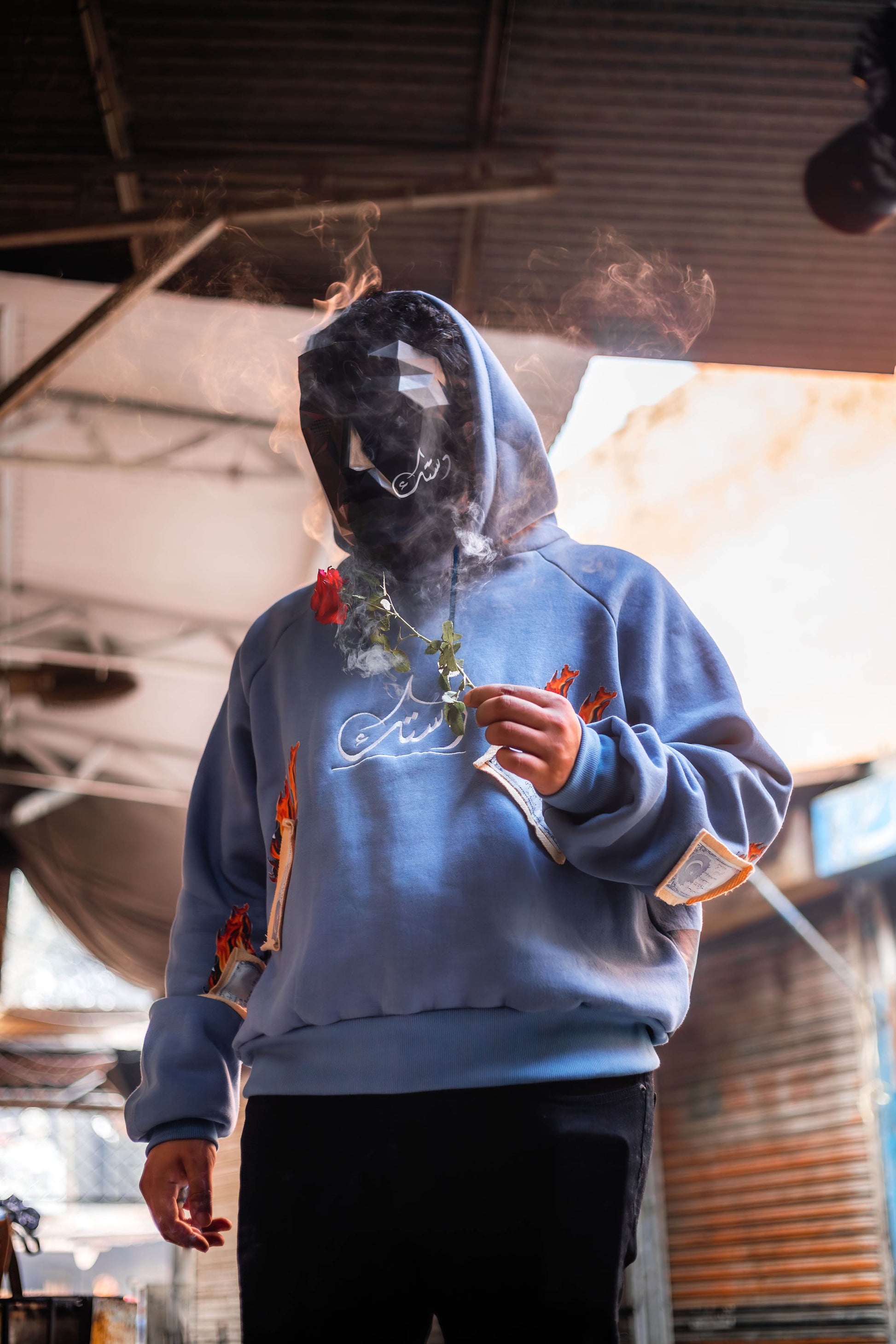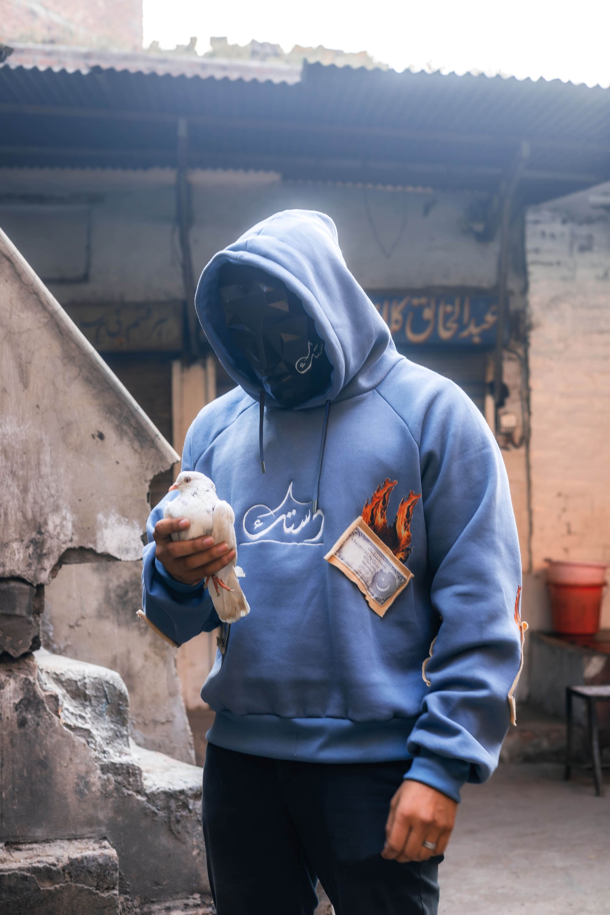 Crafted from 100% cotton fleece, this hoodie merges comfort with a powerful message. The front features the Dastaak logo in elegant embroidery, while the back showcases artistic symbols, including fringed patches of the first bill of Pakistan’s currency with a striking burning effect. This design represents the transient nature of wealth and raises important questions about the true cost of devotion.